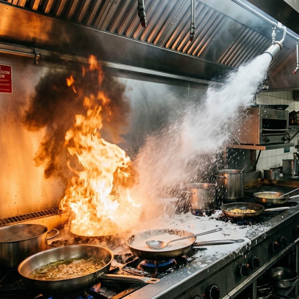Ett våtkemiskt släckmedel sprutas direkt över tillagningsytorna och bildar ett skyddande lager som kyler och kväver branden.